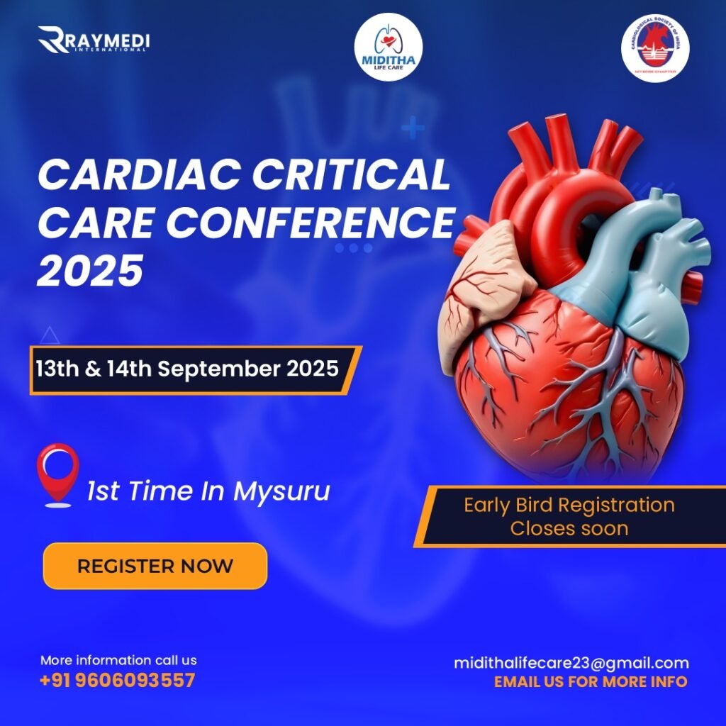 The Cardiac Critical Care Conference is an academic event hosted in Mysuru for the first time. Organized by Miditha Life Care in association with the Cardiological Society of India, Mysore Chapter, the conference will take place on September 13th and 14th, 2025, at the Jayadeva Institute of Medical Science and Research Centre. The event is a platform for participants to share views and exchange technical knowledge with over 250 expected delegates from across the state and neighboring cities. Day 1, September 13th, will be a pre-conference workshop, and Day 2, September 14th, will be the main conference.